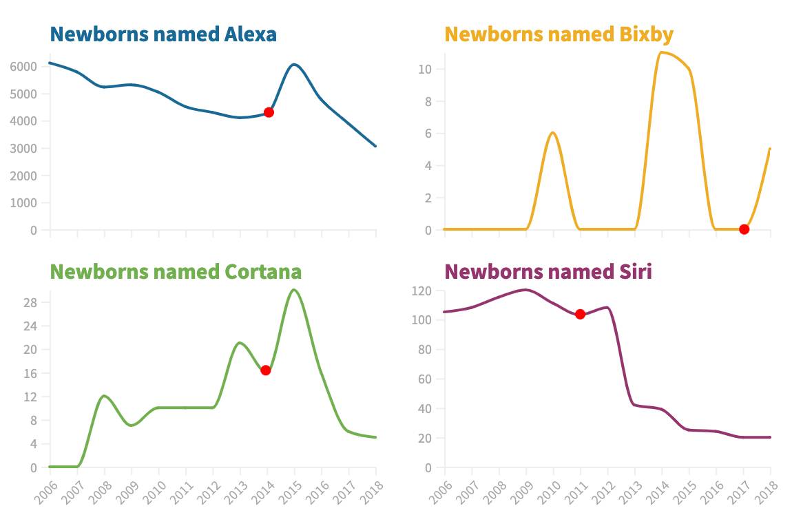 Some info on the figures: the above charts show the number of children born in the US since 2006 with an identical name to an AI voice assistant as registered by the Social Security Administration (SSA). The red dots on the graphs indicate the launch year of each particular voice assistant.